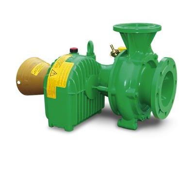 Tractor gear pump with adjustable cutter flange. Spiral housing of grey cast iron. Suction flange with ribbed inlet. Thick matter impeller of spheroidal graphite iron with hardened cutting edges. Cutting plate and wear plate of spheroidal graphite iron. Spur gearing with case-hardened helical angular teeth. Case-hardened pump shaft w. Helical angular teeth and with angular contact ball bearings and cylindrical roller bearings. Mechanical seal (silicium carbide) with oil reservoir. Rinsing connection with geka coupling. Suction/delivery connection dn 150/100.