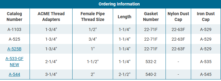 Continental NH3 manufactures male ACME thread to female pipe threaded adapters in variety of sizes. Our male pipe thread adapters are available for female pipe thread sizes from 1/2" to 2". Length, gasket number, nylon dust cap and iron dust caps vary by thread adapters and female pipe thread size.