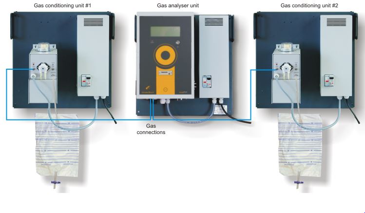 Twin split configuration - analyser and two gas dryers, each on its own mounting plate, each equipped with a power supply module.