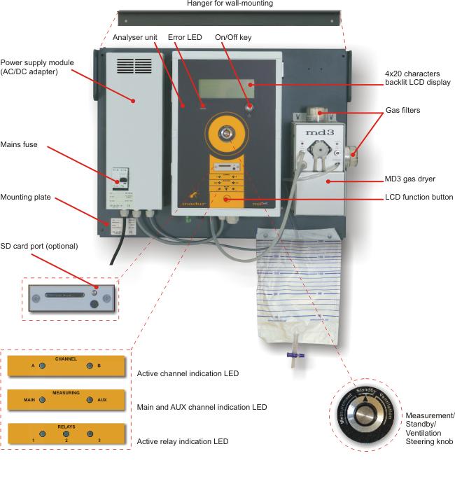 - Standard configuration consists up to 6 sensors (NDIR and/or electrochemical).
