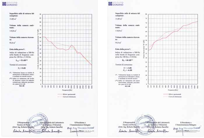 Empirical evidence on the level of sound insulation have been obtained by laboratory tests, carried out according to UNI EN ISO 1403:2006, 140-6:2000, 717-1:2007, 717-2:2007 standards, on a plate slab lightened with the construction system U-Boot® Beton.