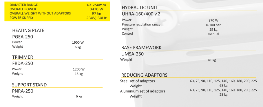 TRACK-250 butt-welding machines serve for joining pipes made of PE, PP, PB, PVDF within the diameter range 63-250 mm. Machines are controlled manually and don`t store welding parameters. TRACK machines are characterised by their simple and light-weight construction. Machines are operated on the basis of table of welding parameters attached to the control panel if hydraulic unit. Timer and stop watch features are integrated into the regulator of temperature also located on the control panel. Newly designed hydraulic system allows for smooth adjustment of press force and max. retraction speed. New solution allowed to reduce the weight and dimensions of hydraulic unit by 25%.