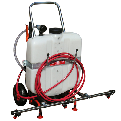 Painted frame. Polyethylene tank. 12-volt with a rechargeable battery. Bar weeding or spraying from 1 meter with 3 nozzles. Pressure 7 bar.