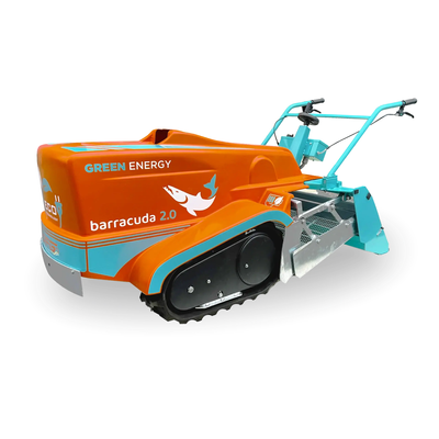 BARRACUDA all-electric beach cleaner 2.0 has two forward and reverse speeds. Working autonomy about 3 hours. It is suitable for cleaning small and medium-sized beaches. The machine is maneuverable and is very suitable for working in small spaces, such as under umbrellas, due to its low structure. Operation is through movement transmitted by the tracks. The machine is equipped with a fixed blade that, at the required depth and for a width of 90 cm, collects sand and debris.