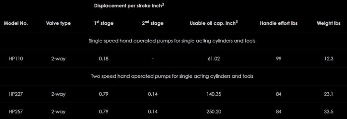 The HP manually operated pump range offers a choice of single or two speed operation and all models are supplied complete with a pre-filled oil reservoir, ready for immediate use. All models have a maximum working pressure of 10000 psi and the range includes pump models suitable for use with either single acting cylinders or tools. The HP range offers the ideal solution for applications where completely independent, portable hydraulic power is required. With low handle effort characteristics for easy operation, all models are of strong durable construction. Hi-Force HP manually operated pumps have a proven track record industry wide and offer excellent value for money in portable hydraulic power. A full range of system components suitable for use with HP manually operated pumps are available.