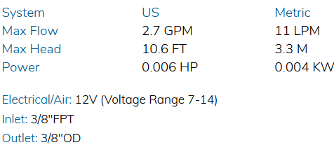March Pump’s industrial 893-07  is an American seal-less centrifugal magnetic drive pump ideal for applications such as chemical recirculation, chemical transfer, and heat transfer. It is capable of generating a maximum flow of 2.7 gallons per minute at 1 foot, and its maximum head is 10.6 Feet (4.5PSI). The standard wet end (the materials that come into contact with the solution) is composed of Noryl, Nylon, Carbon/Teflon, Buna N, Stainless Steel, and Ceramic Magnet. The inlet connection is 3/8 inch female pipe thread, and the outlet is 3/8 inch smooth. The standard motor is a 0.006 Horsepower DC Brushless Motor, available in 12 Volts.  The 12 Volt Motor has an operating range from 7 to 14 Volts.  The maximum internal pressure the pump can tolerate is 50PSI, and the maximum liquid temperature is 190 Fahrenheit or 87 Celsius. The March 893-07 centrifugal magnetic drive pump is capable of handling mildly or highly corrosive chemicals, acids, and solvents. To determine if the March 893-07 is suitable for your application, please contact March Pump.