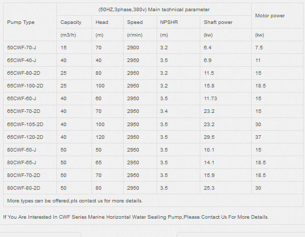The CWFseries marine horizontal water sealing pump is suitable to the protection pump on dredger where it is used to seal the water.lt is also suitable to the bilge pump,cooling pump and fire pump on boats.lt may be used to deliver the sea water.fresh water or other non-corrosive liquid medium lower than 80°C The pump rotates anticlockwise viewed from motor.