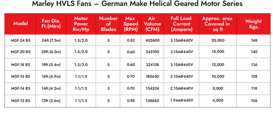 Marley HVLS fans provide massive natural air movement giving you wide coverage cooling with minimum expense. With our fans, you will reduce your carbon footprint and create a comfortable environment at minimum expense.