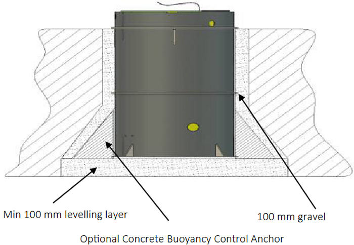 In case of high ground water levels it is recommended to cast a buoyancy control concrete anchor around the bottom of the Mars plant.