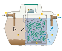 The third chamber is a final settlement zone where fine solids are separated and returned automatically to the first chamber using a recirculation airlift. The treated liquid is then discharged from the system via the tank outlet.