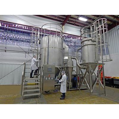 Rotary atomized 2-meter spray dryer with a water evaporation rate of 150 pounds per hour. Full CIP system included.