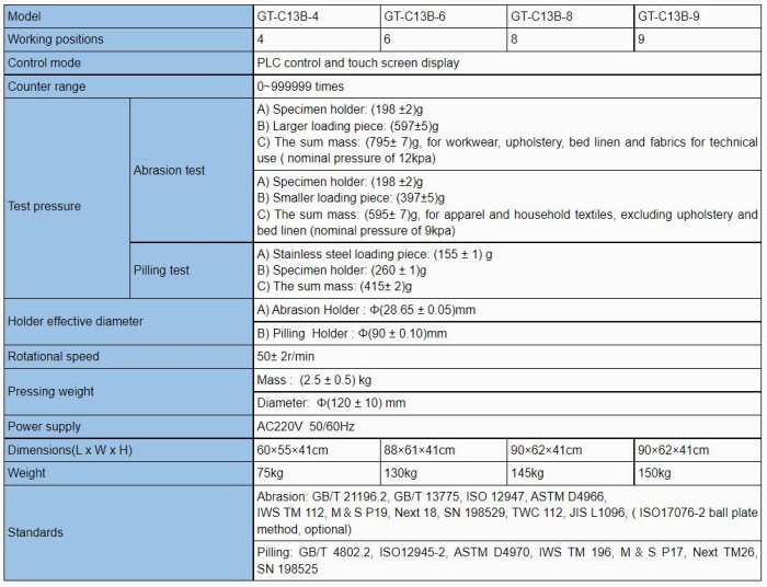 - Abrasion: GB/T 21196.2, GB/T13775: ISO 12947, ASTM D4966, IWS TM 112, M&S P19, Next 18, SN 198529, TWC 112, JIS L1096 (IS017076-2 ball plate method optional)