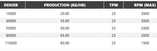 Key Features: Touch screen display with PLC system. Twist type and RPM can be controlled by touch screen display. High efficiency and performance with high speed and precision for production. For opening and closing of door pneumatic system is used. Less noisy and consumption of power is less. High efficiency and performance. Setting of TPM, RPM, direction of twisting and winding tension can be done on screen display. To remove final package, pneumatic spindle is used. Long life and maintenance is less. High productivity with best rope finishing. To analyze and review, production data can be stored. Weight and meter set point. And AC drive fault alarm system. Warning for machine lubrication. Daily, weekly & monthly production reports.