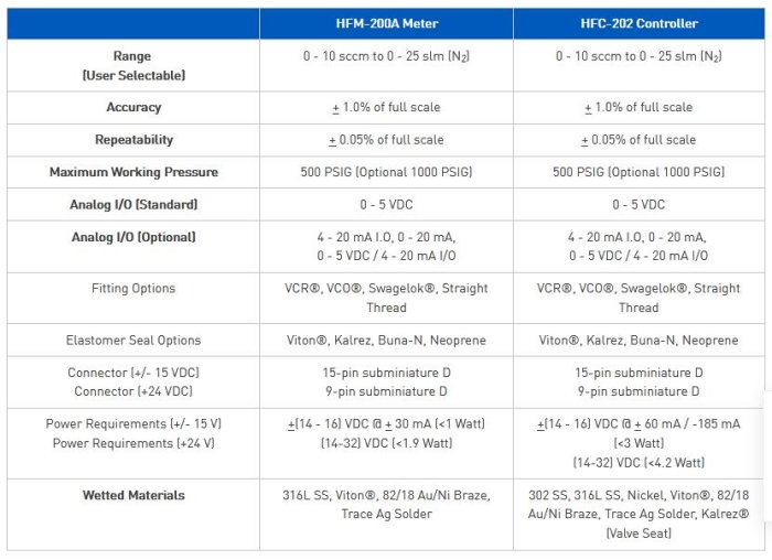 The HFM-200 / HFC-202 meters and controllers have flow ranges from 0-10 sccm to flows of 0-25 slm; provide analog outputs, are constructed of stainless steel and have normally closed valves. The full scale range is specified by the end user. A NIST traceable calibration certificate is standard. Many corrosive gases and pressures up to 1000 psig are easily measured. Cleaning for oxygen service is available.