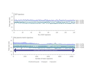 Figure 1. Peak area ratio (raw peak area normalized to IS) from analysis of alprazolam, a pharmaceutical small molecule, and sulfamethoxazole SST (A) and rat plasma matrix (B) injections on the SCIEX 7500+ system. Internal standard-corrected data for 3 drug compounds, showing %CVs of 3-5% across more than 10,000 injections of rat plasma.