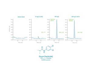 Figure 2. Representative XICs of an example herbicide, diuron, in the solvent blank, in solvent standards at the LLOQ of 10 ng/L and 100 ng/L and in orange juice post-spiked at 100 ng/L acquired in positive polarity using the SCIEX 7500+ system.