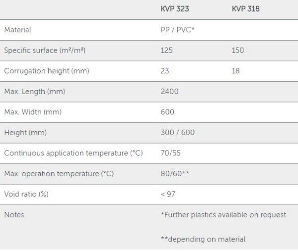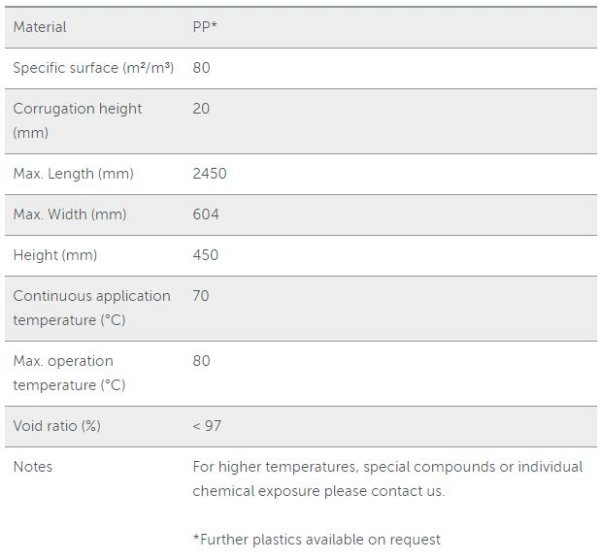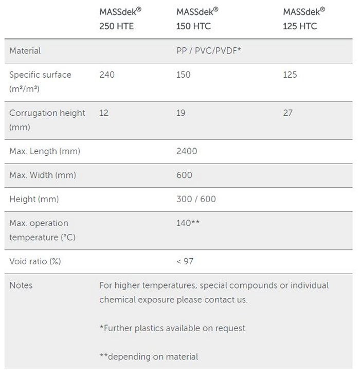 Structured packings MASSdek are high-capacity fills for chemical and physical absorption, desorption and for bio scrubbers. In view of their excellent compression strengths, they are also well suited for bio trickling filters. Due to the special configuration of the fill, a uniform distribution of liquid is maintained under both high and low hydraulic loads.