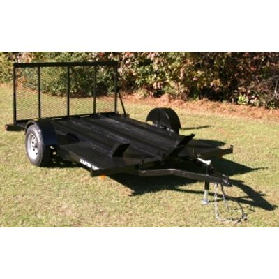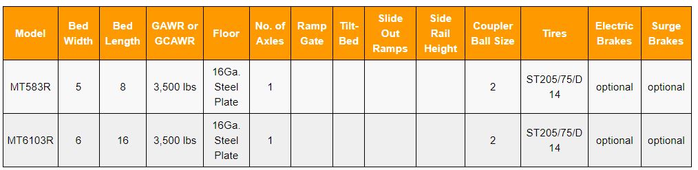 5` & 6`-10" wide Motorcycle Trailers: available in 8` & 10` bed lengths. MT models feature a drop axle, fold-down loading ramp, 3 bike runners, light protectors, and multiple tie down points.; Standard features: 35" long swing-up loading ramp, tip-away tongue jack, 3,500 lb. GAWR, 14" tires & wheels, 16 Ga. Diamond plate steel floor, 6-1/2" wide runners.; Available options: spare tire & wheel mount, brakes.