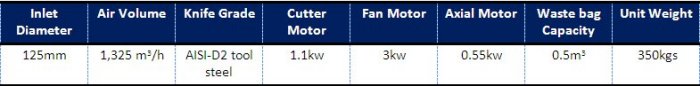 The precision trim cutter efficiently cuts the continuous waste matrix to prevent blockages and roping trims before passing through a centrifugal waste fan and into a plastic waste collection sack for disposal. An integrated oil mist injection system ensures the pressure sensitive waste material does not stick to any of the internal surfaces.