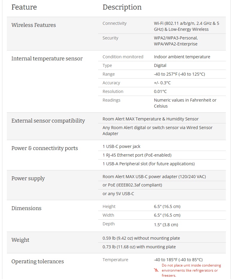 Multiple Network Connection Options: The Room Alert MAX Base Station offers versatile connectivity to suit your infrastructure, including Ethernet 10/100 with Power over Ethernet (PoE) and Wi-Fi 2.4 GHz capability. It can also be powered via the included USB-C power adapter or PoE.