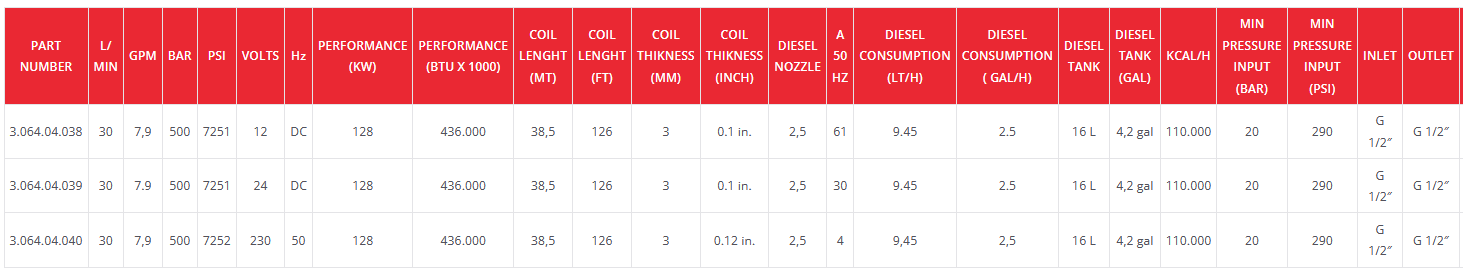 The boilers produced by Mazzoni are high-performance and low consumption. The emission values for gases are lower than those required by recent European regulations. The boiler structure is made of stainless steel and the tube used is 3/8\”. Stainless steel cover and painted steel base, supplied with 17L diesel tank and level inserted in the structure. Safety features: safety valve, water flow control.