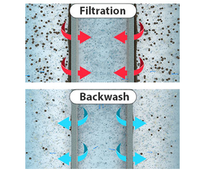 During the backwash, the aeration of the membrane tank continues, with the air from the diffusers and the water returned from the permeate tank cleaning the membrane surfaces.