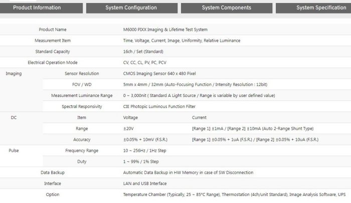 M6000 PIXX Imaging & Lifetime Test System periodically measures the electroluminescence image while driving display devices such as OLED, QLED, Micro and Mini LED, and evaluates the variation of luminance, structural deformation and uniformity through the device life cycle, in addition to the conventional display device lifetime tests including voltage and current measurement.