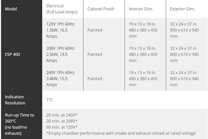- Workspace capacity: 2.8 cubic feet Heat-up time to 260°C (empty chamber with dampers closed):