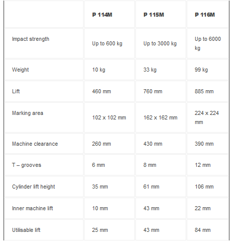 These impact marking machines are characteristic with: Maximum sensitivity and accuracy. Exact setting of impact strength from 0 kN up to a given maximum according to impact mechanism type (achieving even component marking depth with high accuracy). Rich selection of accessories, e.g. various types of symbols, symbol holders, and numbering heads. Compact parameters.