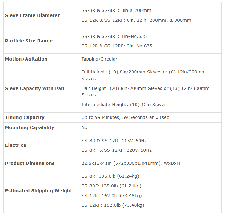SS-12R models recommended particle size range is 2in–No.635 (50mm–20µm). The SS-12R models are supplied with an adapter to accept 8in (203mm) or 200mm sieves.
