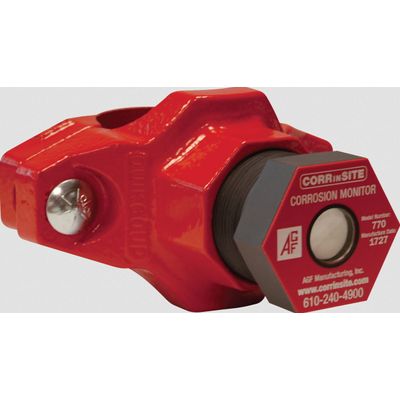 The CORRinSITE is a corrosion monitor manufactured from the same mild carbon steel as the system`s piping, so its surface corrodes at the same rate as the pipe. When the monitor corrodes beyond its limit, moisture penetrates the sealed chamber and transforms the brilliant white sight glass to a fluorescent orange color indicating a corrosion problem and a need for further pipe inspection. The CORRinSITE Model 7800 Mechanical Tee Corrosion Monitor is suitable for retrofitting into existing fire protection systems and is available with a painted red or galvanized steel mechanical tee. AGF CORRinSITE Corrosion Monitors provide a simple to install, maintenance-free, and inexpensive method for hidden corrosion problems in any fire protection system. Before you spend thousands on a nitrogen system, monitor your pipes with CORRinSITE. Custom faceplates available so customers know who to call when the monitor turns orange.