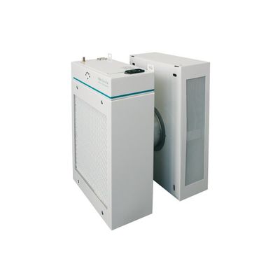 Isolation Unit, 2-piece, for positive or negative room pressure. This Isolation Unit is made for installation on walls or windows. Pressure differences up to 20 Pascal are easily generated. Reccommended for isolation rooms up to 12m2 / 30m3. ISO210 can be used with Remote Control RC100 or RC200. Negative pressure is obtained when the filter unit is placed inside the room, and the ventilator unit is placed outside the room. (infectious patients) Positive pressure is obtained when the ventilator unit is placed inside the room and the filter unit is placed outside the room. (immune-compromised patients). Both parts are connected by a tube – through the wall – which contains an air back-pressure flap (standard) and fire damper (optional). Filters used in this Isolation Unit are of HEPA14 or ULPA15 quality, leaktested and airtight secured.