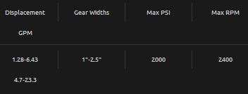 Gear: Displacement is in cubic inches. Measurements are taken at 1000 RPM.