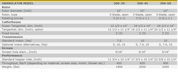 The new 300 Series medium-size granulators are used for central or beside-the-press operation with all kinds of molding processes. Typical waste includes sprues, runners, molded items, profiles, smaller pipes and sheets. The big benefit with Rapid’s “open-hearted” engineering concept is that it provides direct and easy access to the heart of the machine and gives very rapid cleaning and maintenance times for fast production changeovers. The clear access to core machine parts also allows “visibly clean” inspection and approval, preventing contamination at color and material changes.