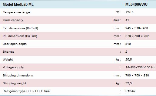 Forced air circulation, automatic defrost. Electronic controller with digital display: Temperature alarm visual / audible, - Excess and insufficient temperature alarm, Open door alarm, External finish white painted steel plate. Glass door, lockable. Door hinges right. 2 shelves. Interior made of plastic.