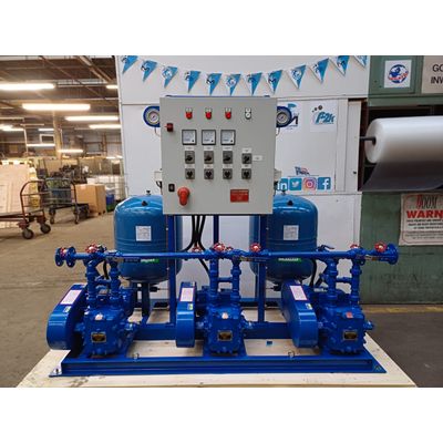 Megator marine pressure sets are compact self-contained units, incorporating the highly successful sliding-shoe pumps, hydraulic accumulator, inter-wired control panel and all interconnecting piping assembled on a fabricated steel frame. On-board installation only requires piping connections to suction and discharge manifolds, connection of main electrical supply to control panel.