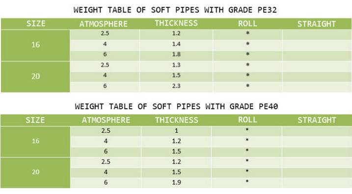 According to the standards of drip irrigation pipes can tolerate up to 4 atm. These pipes are produced from low-density polymers, PE32 and PE40 grades with a special production line for LDPE pipes in diameters of 16 to 32 mm and working pressure of 2.5 to 6 atmospheres.