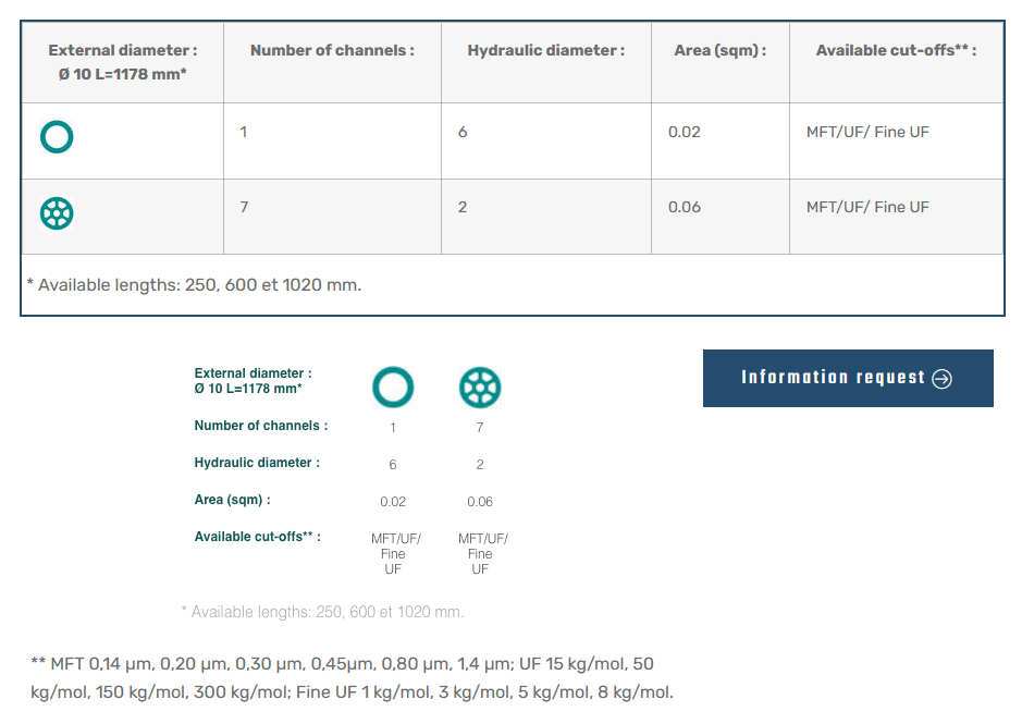 Tubular ceramic membranes ø 10 entirely made of high purity materials. Two geometries are available, correspond to user’s needs. These ceramic membranes allow all operations of separation in Microfiltration, Ultrafiltration and Fine Ultrafiltration. The permeate flux performances, their low hold-up volumes and reduced energy consumption give them unequalled possibilities.