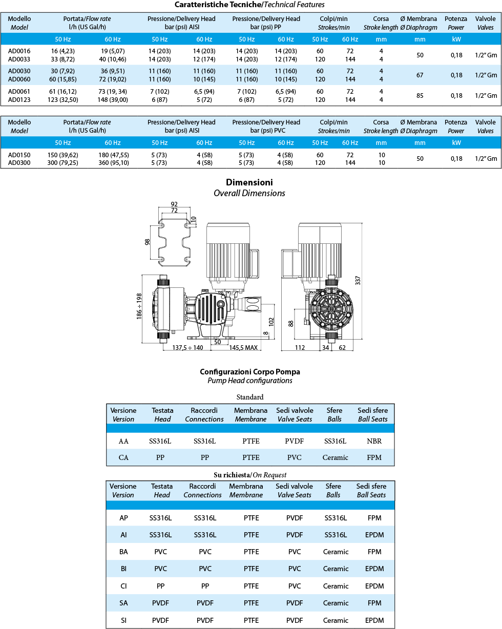 - Pump head: PP, PVC, SS316 or PVDF