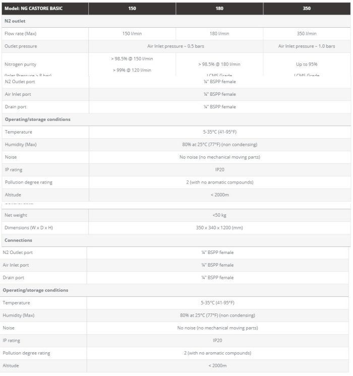 The NitroGen series NG CASTORE BASIC are Membrane Nitrogen Generators. They are engineered to transform standard compressed air into a safe, regulated supply of Nitrogen with a purity up to 98.5%. The NG CASTORE BASIC has been developed to meet specific requirements in terms of gas, flow, purity and pressure in LC-MS applications. It can be also used for the evaporation of solvents in samples being analysed.