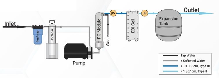 - Pure water quality (with EDI): < 1 μS/cm, Type II