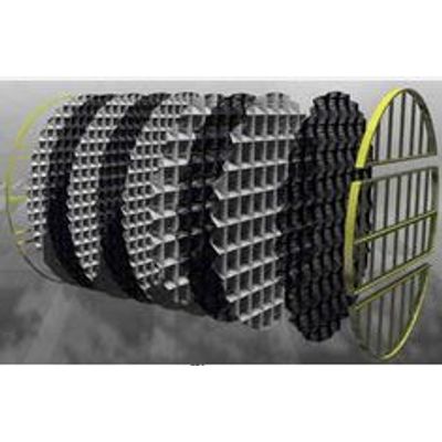 Kimre mesh pads offer high efficiency mist elimination. The pads employ a unique woven structure and a variety of filament sizes and weave densities. The woven material produced is in relatively thin layers (2.5 mm to 50 mm thick) with a pad being assembled from a number of layers which may be the same or may vary in weave and composition. As such a pad can be designed to achieve a given mist removal performance, liquid handling capability etc. This method of construction results in predictable, reliable performance and also allows for easy cleaning by pulling the individual layers apart and washing them. Kimre pads can also be used as mass transfer media in packed towers.