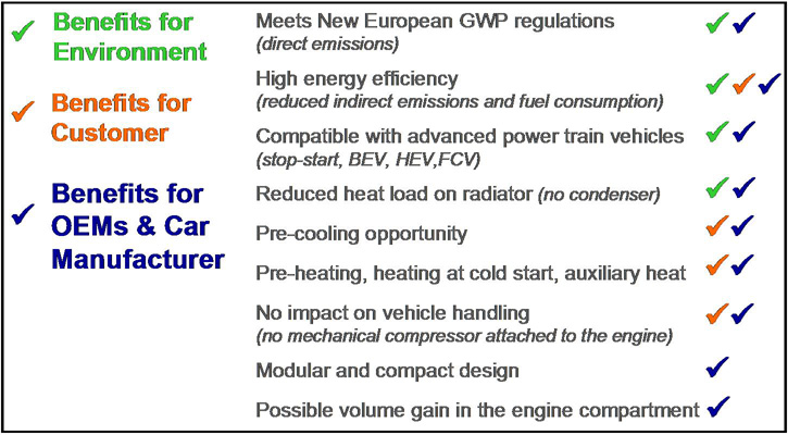 With Centro Ricerche Fiat (Torino, IT) Ergenics developed an electrically powered hydride air conditioner proof-of-concept prototype as a possible replacement for traditional mobile air conditioners. The unit does not contain materials with global warming potential and thus meets European Union guidelines for eliminating R-134a by the year 2011. The unit operated with more than twice the efficiency of today’s automotive air conditioners.