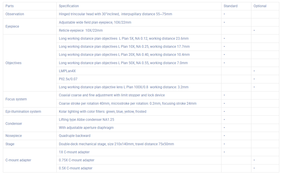The metallographic microscope MJ31 is mainly used in manufacturing fields such as semiconductors, FPDs, circuit boards, metal materials, precision tools, etc., and is suitable for teaching and research.