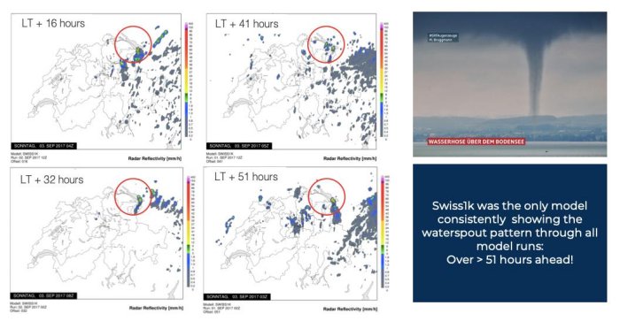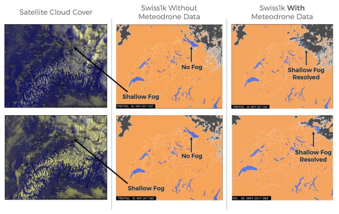 The hyperlocal Swiss1K model is also required for aerodrome   operational forecasts, which have particular skill in forecasting fog formation and clearance, icing, thunderstorms and lightning. An example of this is the recently completed DETAF (Drone Enabled Terminal Airport Forecast) project at Zurich airport where independent verification proved the value of Meteodrone data and its assimilation into hyperlocal weather models for airport operations.