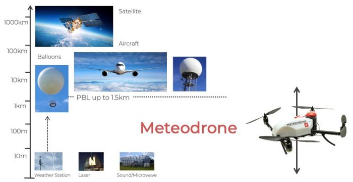 Existing weather models are struggeling to accurately predict local weather phenomena such as fog, strong winds and thunderstorms. This is primarily due to the limited amount of data available in the lowest layers of the atmosphere. An important step towards more forecasts are the own in-house designed, developed, manufactured, patented and operated Meteodrones. They collect data within the planetary boundary layer (approximately 3 km above ground). This allows to carry out highly precise measurements of temperature, humidity and windspeed in the planetary boundary layer.