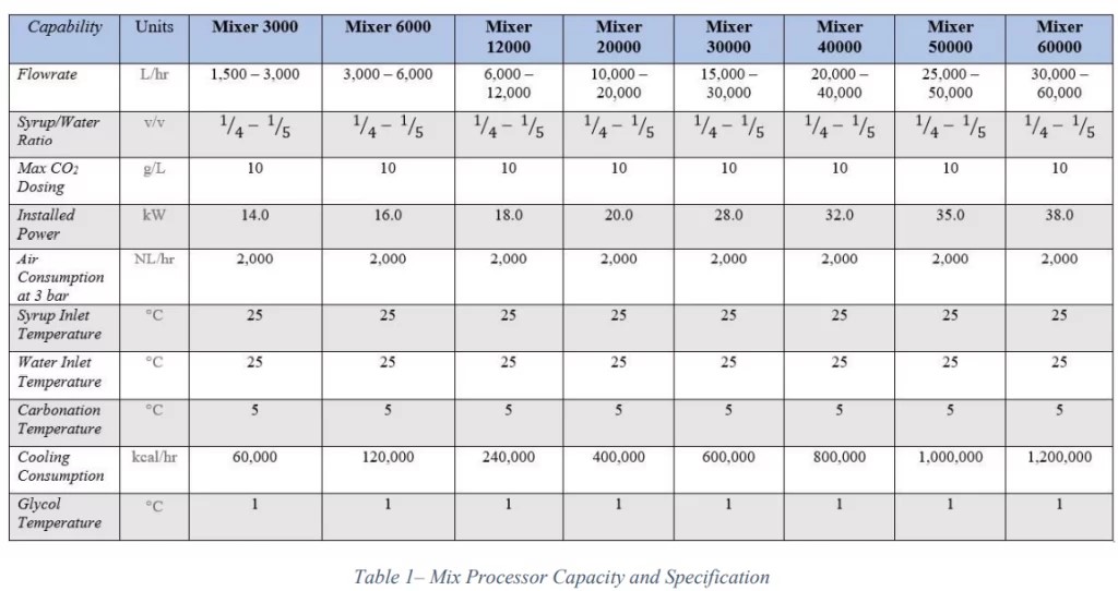Meter-based mix processors are designed to produce carbonated beverages metering syrup, deaerated water, and CO2. The mixed product is cooled by a plate heat exchanger with glycol. The finished mix product can also bypass the blender portion of the mixing processor and be chilled and carbonated. Instruments, automatic valves, and controls with electronic processors adjust the parameters according to with the selected recipe. The mixed product is delivered to a filler via a transfer pump that is tuned with the filler. Includes remote technical support functionality.