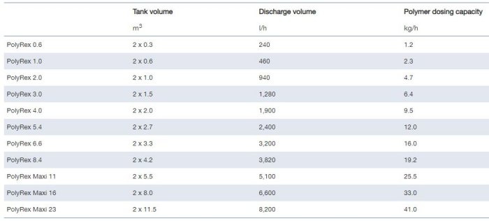 Capacity range of up to 8200 l/h. The metering system PolyRex is a double-decker batching station for the processing of liquid and powdered polymers. It consists of the feed and mixer unit and the two stainless steel double-decker tanks. The polymers used are ideally utilised.