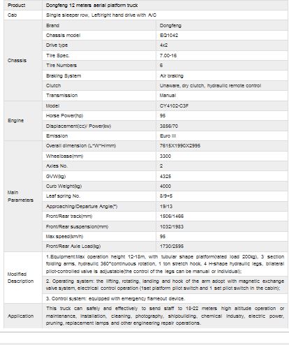 DongfengModel 12 -Meters Aerial Platform Trucks