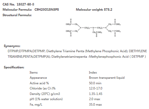 DTPMPA is innocuous, easy to be dissolved in acid solution. DTPMPA has excellent scale and corrosion inhibition and good thermal tolerance ability. DTPMPA can inhibit the scale formation of carbonate, sulfate and phosphate. On situation of alkali environment and high temperature (above 210℃) DTPMPA has better scale and corrosion inhibition effect than other organophosphines.